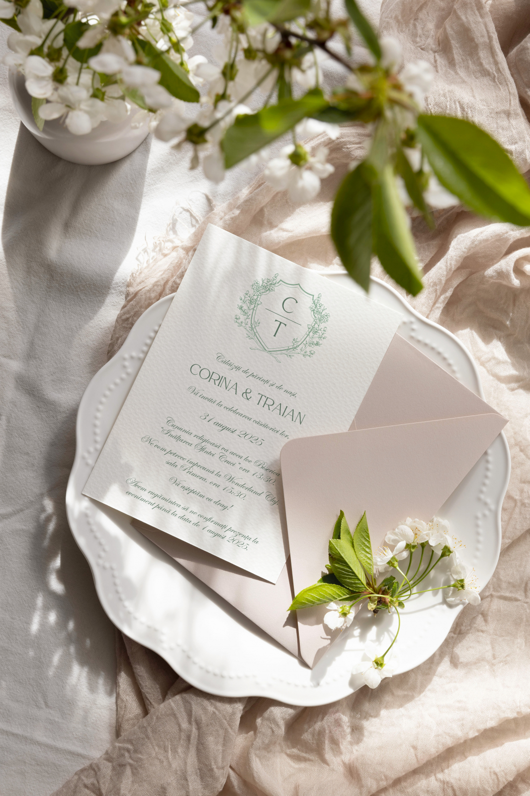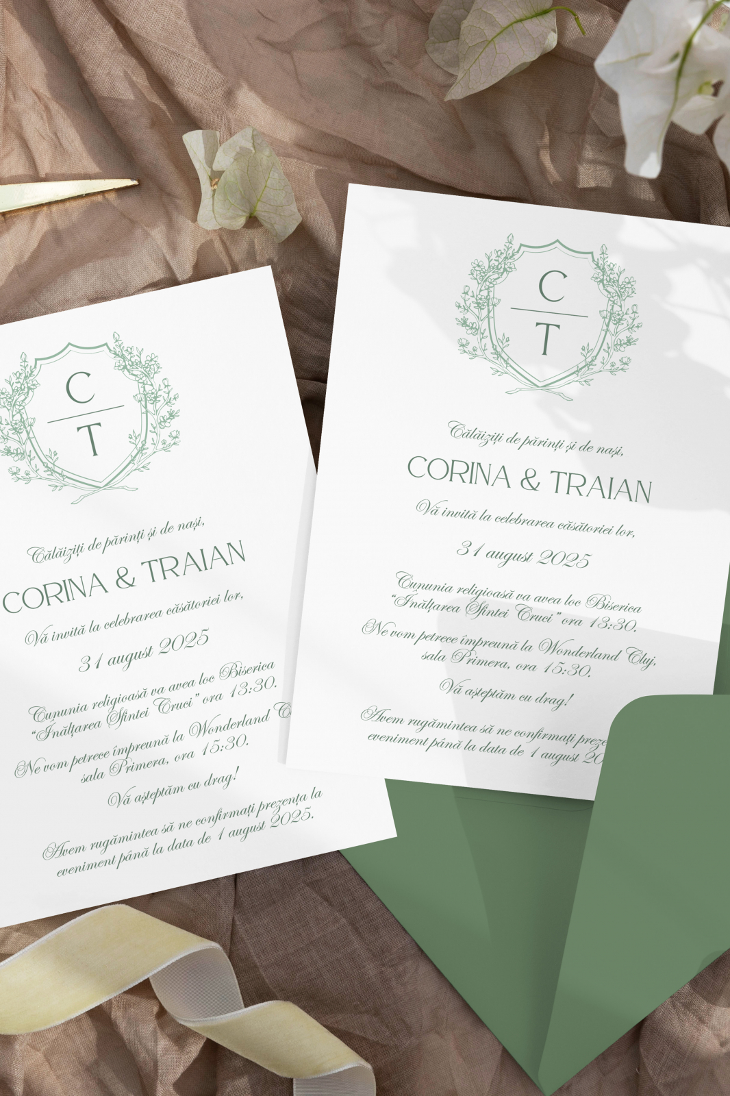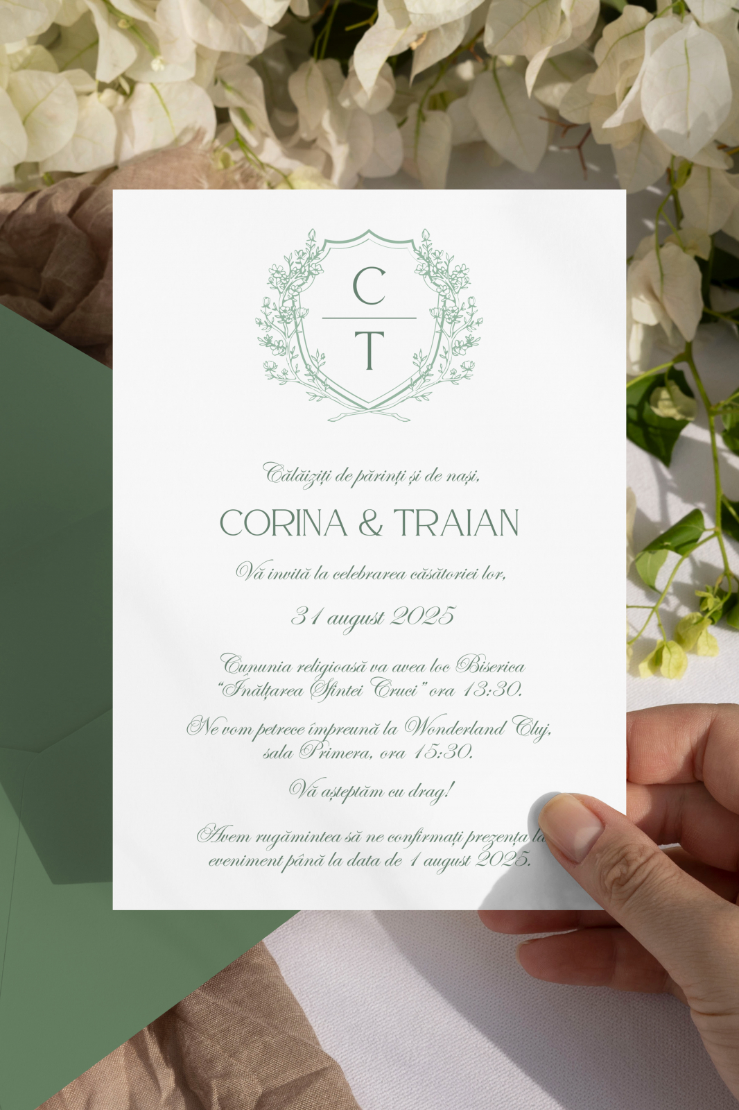 – Text complet personalizat (nume, dată, ore, locații)
